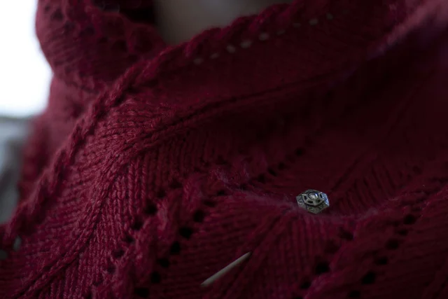 A uniquely symmetrical scarf, Herringbone Heart Bottoms is named for the three points at each end of the herringbone columns. It’s a quick knit that’s good for learning basic cable and lace techniques and gives you a great place to wear a vintage pin.